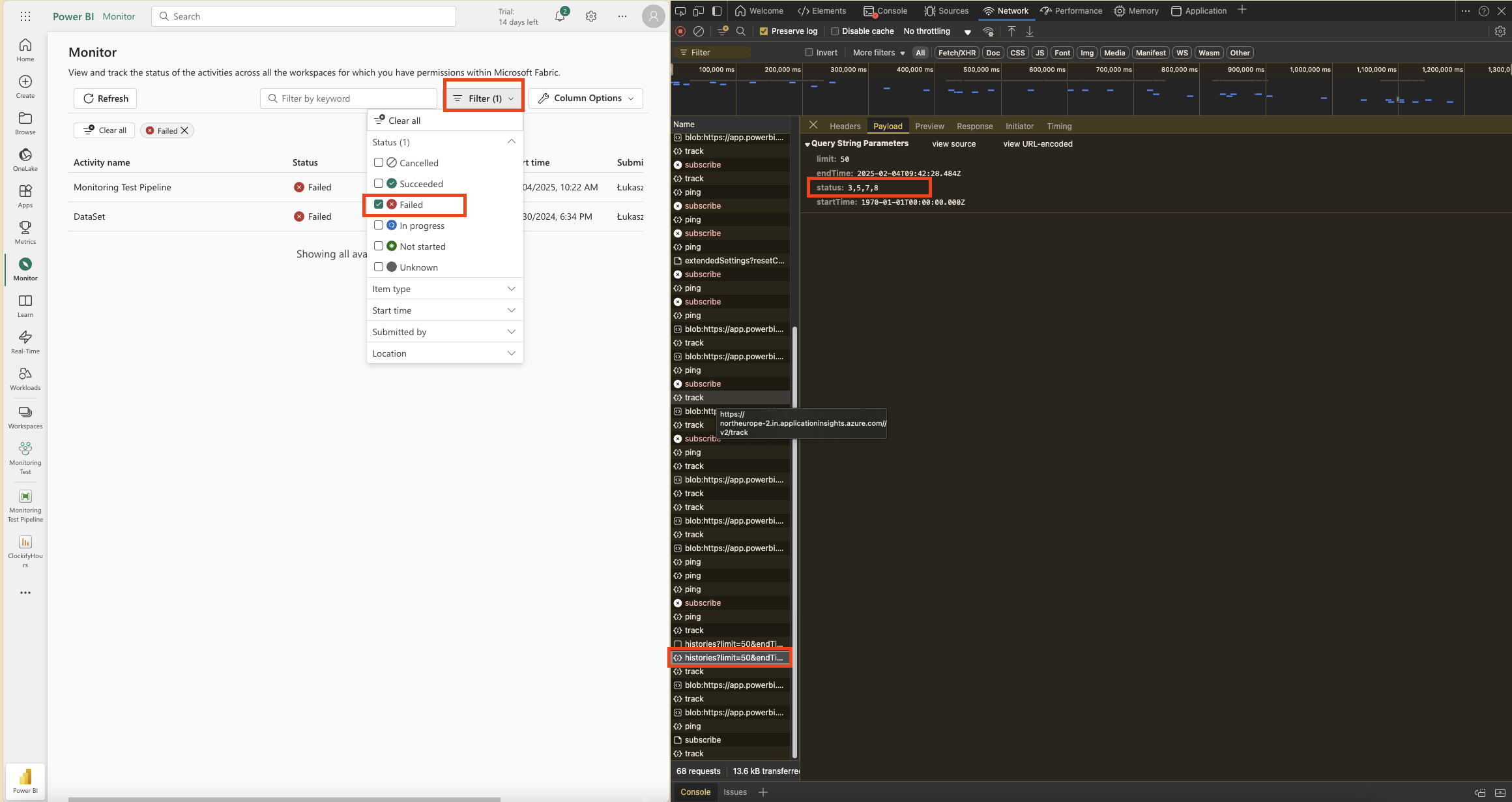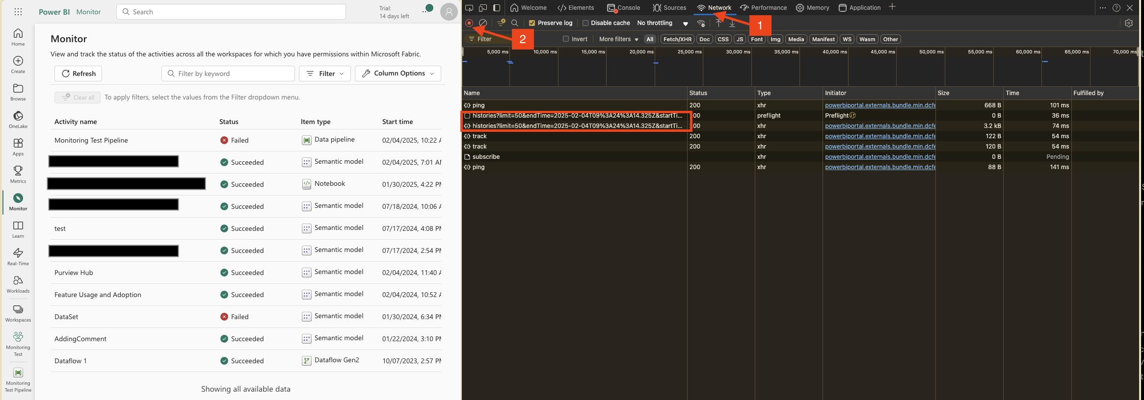 Here’s what I did: I opened Developer Tools (hit F12 in most browsers), switched to the Network tab, and started recording all API calls. Then I opened the Monitoring Hub tab in Fabric: