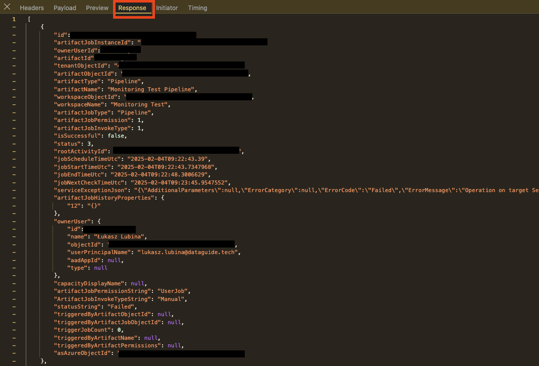 As you can see in the screenshot, several API calls are being made. The highlighted one is particularly interesting—this is the actual endpoint that Monitoring Hub uses to fetch execution data.